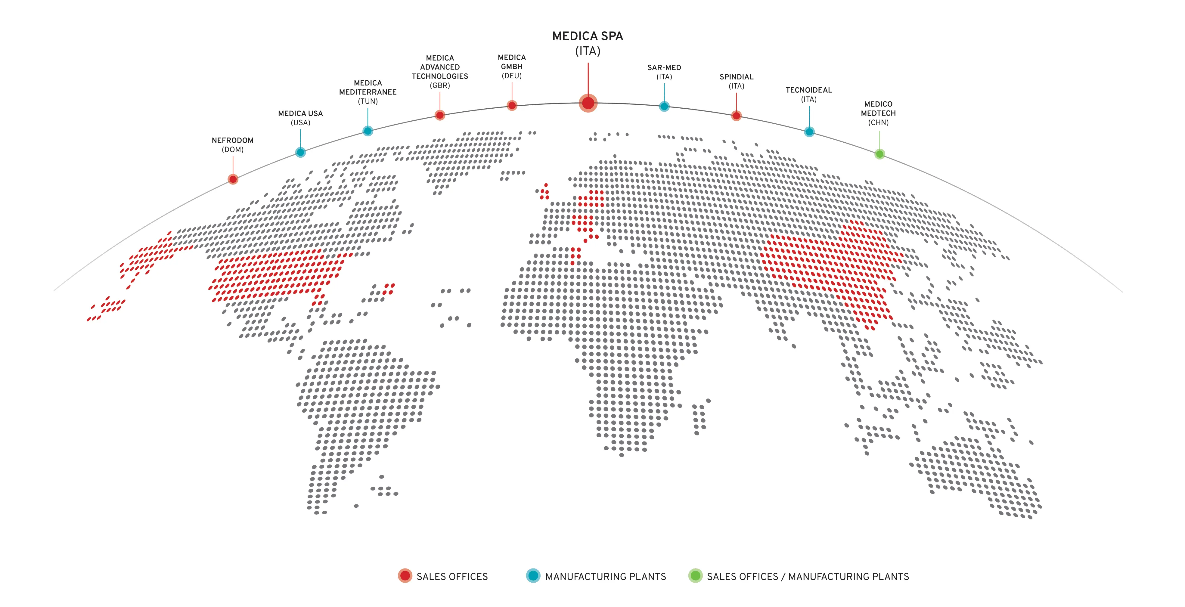 Le attività di R&D sono state integrate negli anni a una capacità produttiva a elevata automazione in vari stabilimenti, sia in Italia e all’estero, dove Medica S.p.A. è presente anche con diverse filiali.